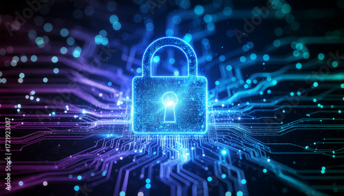Cybersecurity concept, digital padlock over abstract background, neon blue colours