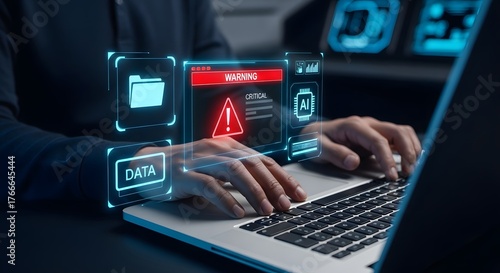 Cybersecurity concept hands typing on a laptop with a warning alert and data icons displayed on a futuristic holographic interface, representing cyber threat and data protection
