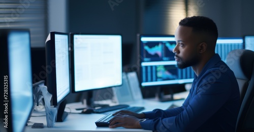 Cybersecurity expert in a dark office, analyzing threats on multiple screens.