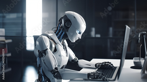 cyborg android Robot working with laptop in office
