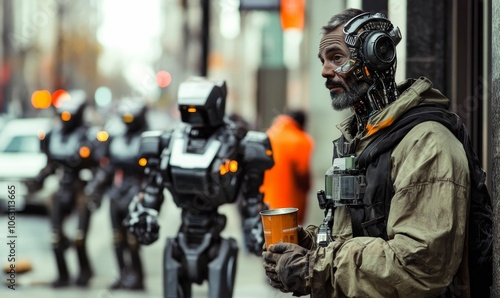 cyborg, human, robot, city, street, futuristic, technology, cyberspace, artificial, intelligence, android, machine, future, metal, chrome, wear, man, urban, glove, cup, begging, metallic, gloomy, grey, brown, orange, colours, background