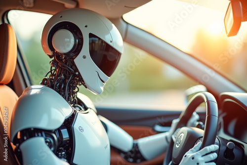 cyborg, robot, car, driving, driver, drive, auto, vehicle, wheel, concept, automobile, person, inside, transportation, steering, transport, smiling, technology, three-dimensional, interior, ai, sitting, futuristic, future, android, space, science, computer, robotic, artificial