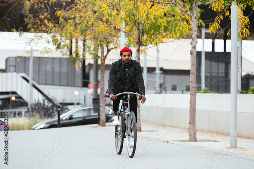 travel, transportation, technology, street, sport, road, red, people, pavement, outdoors, motion, man, leisure, hat, fall, denim, bicyclist, city, black, bike, bicycle, autumn, copy space, african, full body, 30, one person, copy space, winter, wheel, vintage, vehicle, urban, male, person, adult, adult, 20s, grown-up