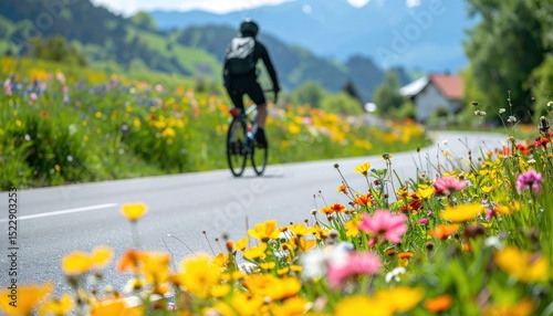 biker, cycling, flower, field, meadow, road, asphalt, mountain, landscape, nature, outdoors, summer, spring, sunny, day, rural, village, house, greenery, plant, blossom, vibrant, colourful, yellow, pink, red, green, blur, distance, sky, hill, travel, adventure, sport, exercise, healthy, lifestyle, recreation, activity, journey, helmet, backpack, bicyclist, riding, pathway, wildflower, countryside, scenery, calmness
