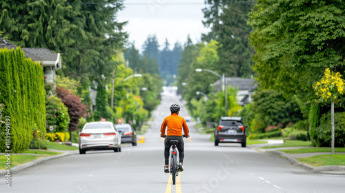 cyclist rides through peaceful suburban street, surrounded by lush greenery and residential homes. scene captures serene moment of commuting in nature