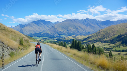 Cyclist riding road bike on scenic mountain road, solo journey through breathtaking landscape, adventure and freedom on two wheels
