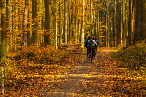 Cyclists on the forest path. Autumn in the forest. Tricity Landscape Park, Gdansk, Poland