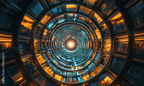 Cylindrical architectural design featuring vibrant blue and orange lighting, circular perspective, and a central bright light source