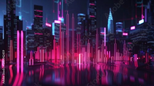D stock market graph with rising bars, dark city skyline, and neon lights in the backdrop