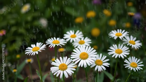 Daisies in the Rain, Charming Garden Scene, Abstract Background