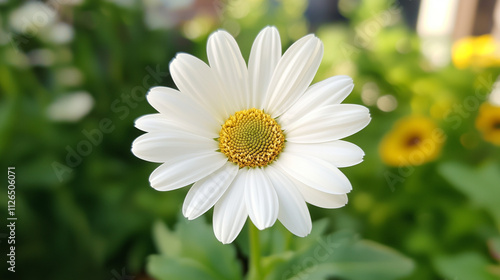 Daisy Delight: A solitary white daisy blooms in a lush garden, its delicate petals unfurling in the warm sunlight. Its vibrant yellow center adds a pop of color to the scene.