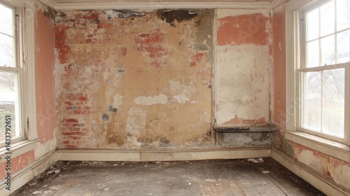 room, interior, wall, brick, exposed, damaged, decay, old, aged, abandoned, derelict, building, house, structure, renovation, repair, construction, demolition, dilapidated, worn, peeling, in plaster, paint, brown, red, beige, tan, white, window, light, daytime, empty, vacant, floor, dust, debris, mess, desolate, gloomy, texture, pattern, background, vintage, retro, historical, architecture, property