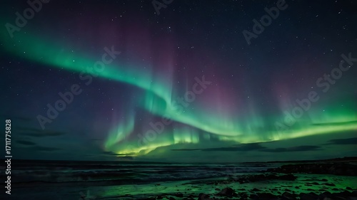 aurora, borealis, northern, light, sky, colourful, wave, star, night, atmosphere, celestial, glow, landscape, nature, arctic, polar, motion, high-coloured, energy, cosmic, space, horizon, scenery, magnetic, beauty, shimmer, nightscape, phenomena, radiance, skyline, earth, green, purple, illumination, vibrant, dance