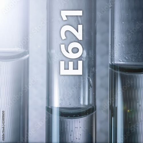 Dangerous food additive flavor enhancer - monosodium glutamate E621 in a medical test tube