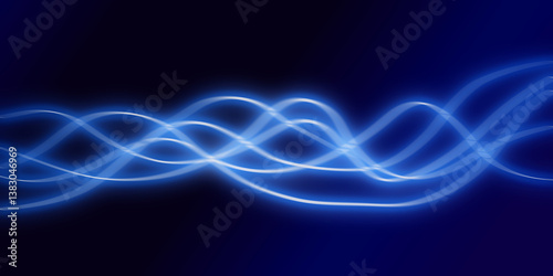Dark abstract background with blue neon glowing lines. Abstract background, neon light, laser show, impulse, pulse power lines, energy impulse, blue glowing dynamic lines. Technology background