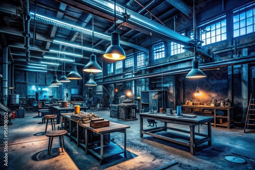Dark and gritty metal shop with fluorescent lights and steel furniture