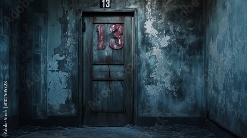 Dark and moody scene of a weathered door marked with the number 13, set in an old, decaying hallway with cracked walls and peeling paint. AI generated.