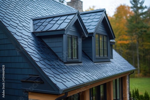 Dark blue metal roof tiles on a contemporary house with stylish dormer windows