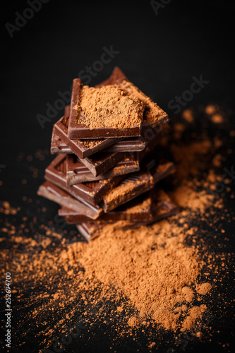 dark chocolate stack and cocoa powder