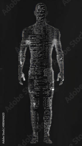 Dark digital human figure with abstract text design
