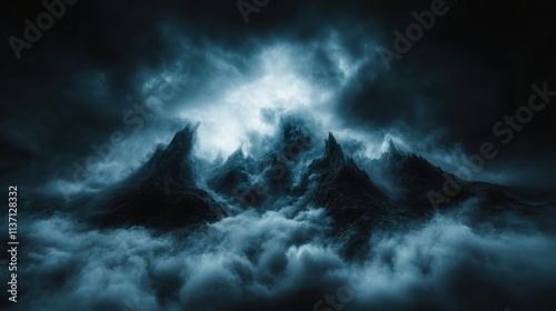 dark, fantasy, mountain, peak, cloud, fog, mist, stormy, dramatic, moody, atmospheric, ominous, mysterious, aethereal, gothic, landscape, scenery, nature, environment, mystical, surreal, night, shadow, silhouette