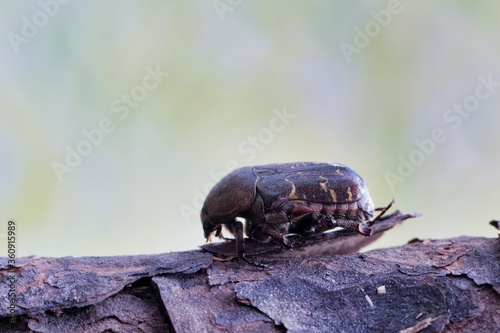 Dark Flower Scarab beetle on a piece of bark side view. It is found in the USA and Mexico. They are considered pests as they feed on corn crops and a variety of flowers.