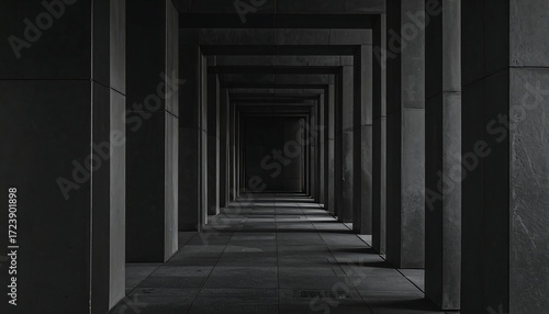 dark, hallway, concrete, column, straight, perspective, architecture, geometric, minimalist, empty, tunnel, grey, lined, depth, light, shadow, monochrome, long, wide, parallel, structured, modern, urban, interior, corridor, passage, evacuated, industrial, design