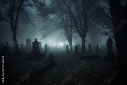 Dark graveyard at night, shrouded in thick fog and an eerie horror atmosphere. Ai generated