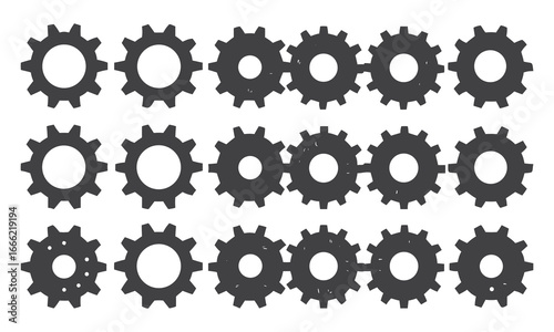 Dark Grey Gear and Cogwheel Icons in Rows on White Background silhouette