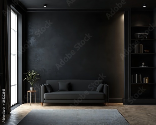 Dark living room interior with black walls and comfortable black sofa.