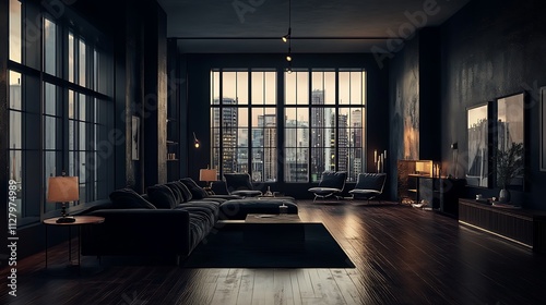 apartment, loft, interior, design, dark, luxury, modern, city, view, window, living, room, furniture, sofa, chair, decor, home, style, elegant, stylish, contemporary, architecture, space, lighting, mood, evening, night, urban, skyline, residential, real estate, highrise, sophisticated, dramatic, cosy, comfortable, relaxing, ambience, aesthetic, minimal, industrial, chic