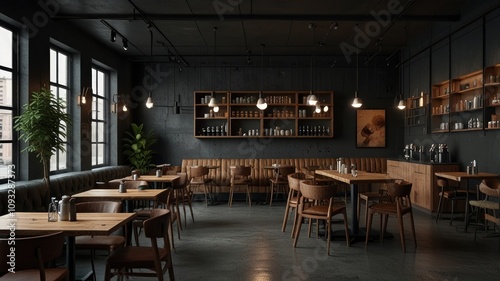 cafes, hot drink, shop, eatery, interior, design, modern, dark, wood, furniture, shelving, table, chair, lighting, window, wall, floor, plant, book, industrial, room, space, ambience, atmosphere, style, aesthetic, cosy, comfortable, elegant, sophisticated, vintage, rustic, minimalist, contemporary, seating, area, bar, counter, brown, grey, concrete, loft, building