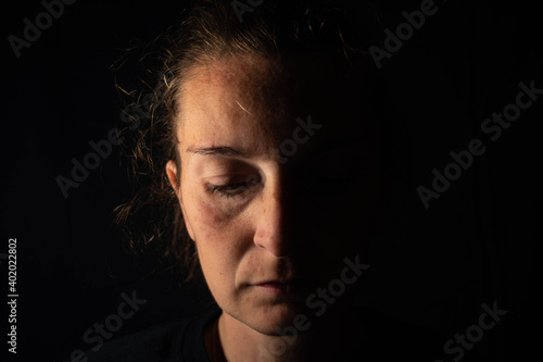 Dark portrait of a serious woman with half illuminated face. The woman is looking down showing sadness or depression