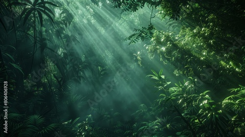Dark rainforest, sun rays through the trees, rich jungle greenery. Atmospheric fantasy forest. 3D illustration.