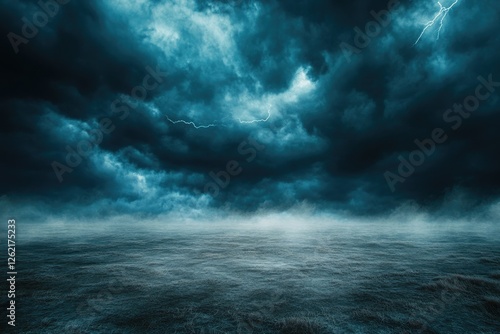 Dark, stormy clouds loom over a misty field, lightning flashes across the ominous sky.