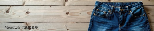 Dark wash denim jeans, folded neatly, light wood planks, textile, jeans, photography