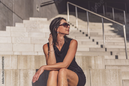 Dark-haired woman posing in a black dress on the concrete stairs. The woman is wearing black sunglasses. It's a beautiful sunny day.