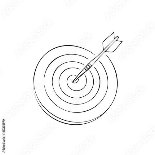 Dart hitting target bullseye - hand drawn vector illustration, competition and archery concept