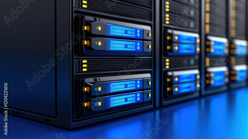 Data servers with blue lights and sleek design