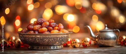 date, bowl, teapot, light, festive, food, holiday, ramadan, dessert, sweet, fruit, gold, delicious, healthy, organic, natural, traditional, culture, celebration, background, texture, warm, cosy, elegant, rich, dark, brown, metal, ornament, shiny, photo, image, picture, stock, photo, illustration, design, template, marketing
