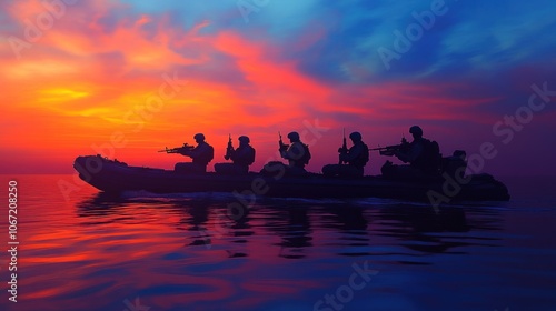 Dawn Military Mission - SEALs on a mission at dawn, silhouetted by the emerging colors of the sunrise on a calm sea.