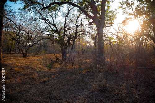 Dawn sunshine through trees