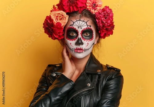 day, dead, make-up, flower, crown, costume, face, paint, festival, tradition, culture, skeleton, art, floral, colourful, portrait, yellow, background, celebration, festive, latin, heritage, person, eye, design, detail, celebratory, symbol, traditional, representation, vibrant, leather, jacket, red, rose, decoration, holiday, mexican, expression