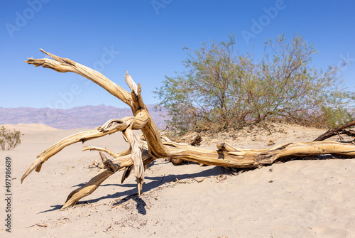 Dead tree in the desert at Mesquite Dunes the Death Valley National Park.