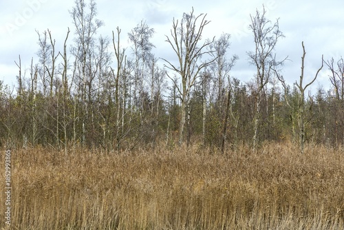 Dead trees, reeds in front, Osterwald, Zingst, Fischland-Darß-Zingst, Western Pomerania Lagoon Area National Park, Mecklenburg-Western Pomerania, Germany