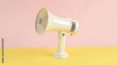 declaration. Classic announcement device on simple pastel backdrop, product launch decks, UI/UX mockups, data dashboards, designed for product launches and innovation pitches, used by researchers.