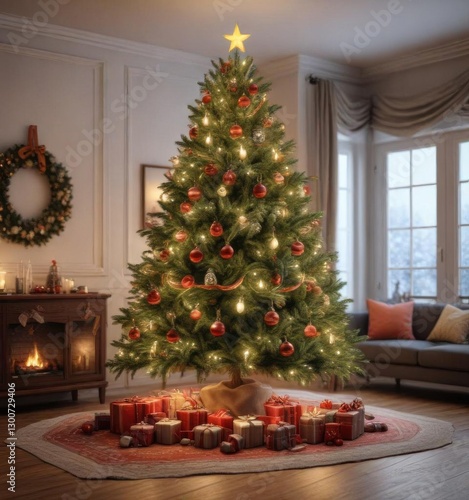 Decorated Christmas tree in a cozy living room background , mantel, christmas