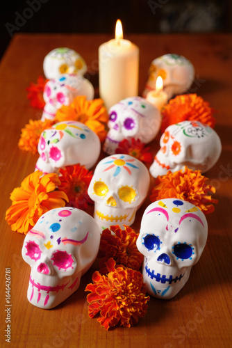 Decorated Sugar Skulls with Marigold Flowers and Candles Background — Día de muertos