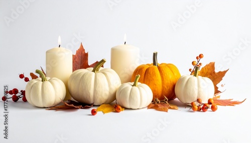 Decorative autumn arrangement with white and orange pumpkins, lit candles, fall leaves, and berries on white background for editorial seasonal photography Thanksgiving design and poetic decor-themed v