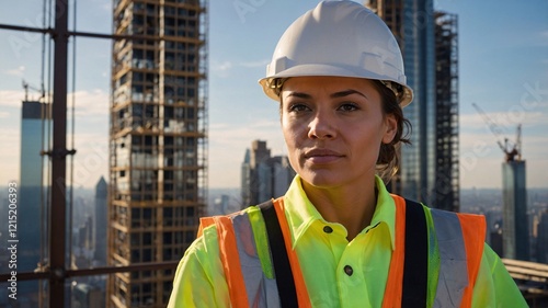 Dedicated construction worker surveying the skyline from a high-rise site during sunset in a bustling urban environment